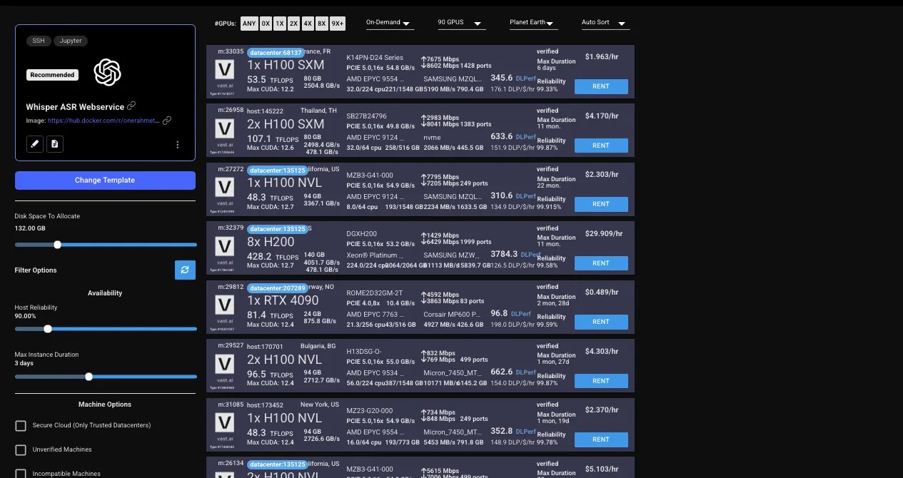 - After you select the template by pressing the triangle button the next step is to choose a gpu.