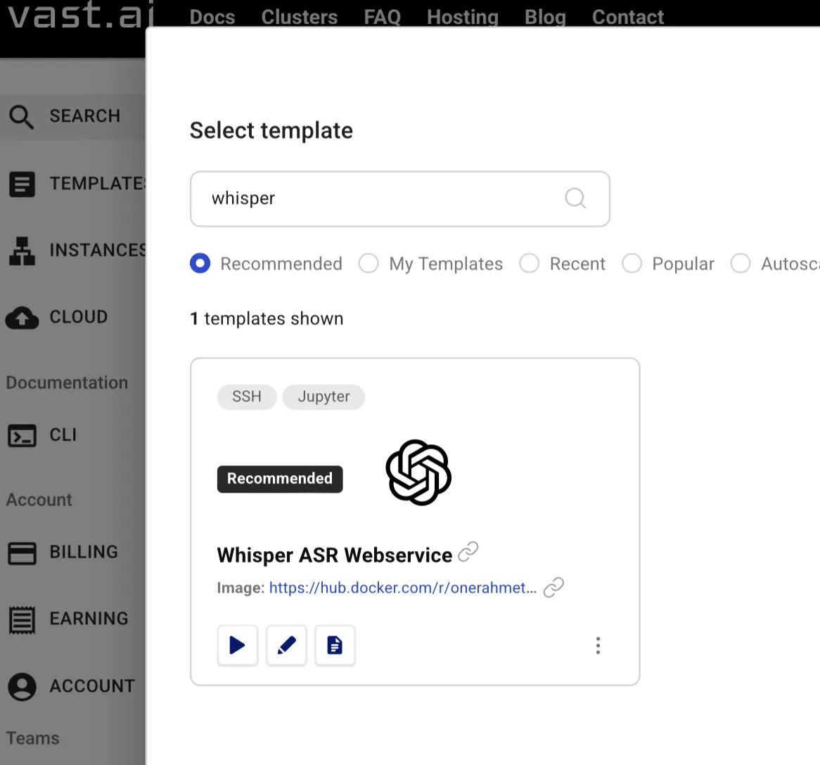 - Go to the templates tab and search for “Whisper” or click the provided link to the template here .